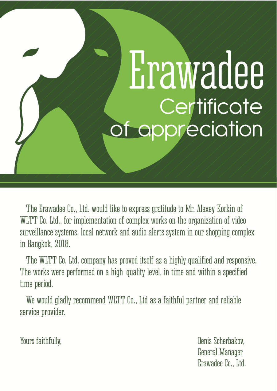 The Erawadee Co.,Ltd would like to express gratitude to Mr. Alexey Korkin of WLTT Co.,Ltd for implementation of complex works on the organization of video surveillance system, local network and audio alerts system in our shopping complex in Bangkok, 2018.